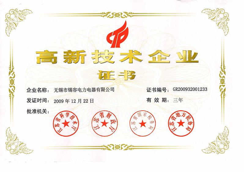2009年12.22日,無錫市錫容電力電器有限公司獲取高新技術企業證書,批準機關:江蘇省科學技術廳、江蘇省財政廳、江蘇省國家稅務局,江蘇省國家稅務局